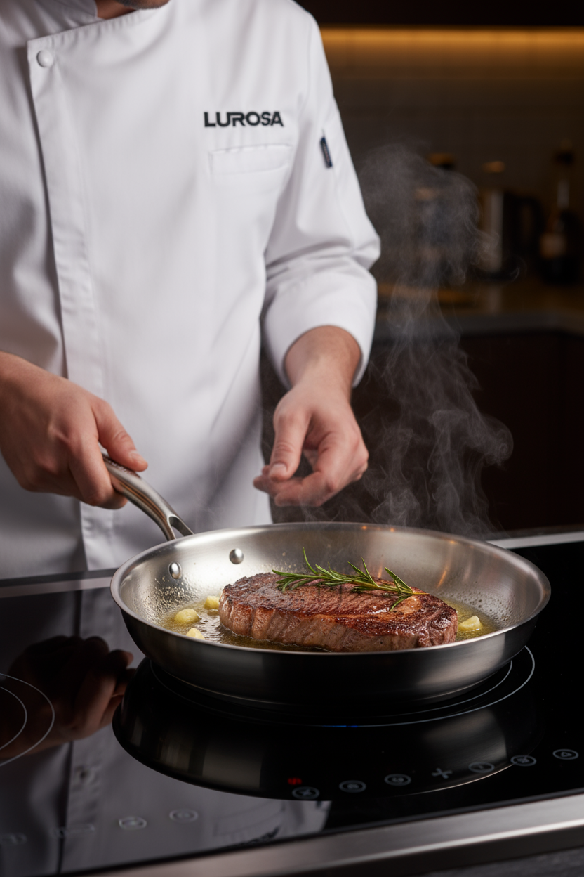 Haltbarkeit und Langlebigkeit: Viele herkömmliche Pfannen nutzen sich mit der Zeit ab, die Beschichtung blättert ab oder die Pfanne verzieht sich bei grosser Hitze. Die Lurosa Pan ist auf Langlebigkeit ausgelegt. Ihr Innenleben aus reinem Titan ist extrem langlebig und korrosionsbeständig, während der Aluminiumkern für eine schnelle, gleichmässige Wärmeverteilung sorgt. Das bedeutet, dass sich Ihre Pfanne nicht verzieht und Sie sie nicht wie andere Pfannen alle paar Jahre ersetzen müssen.